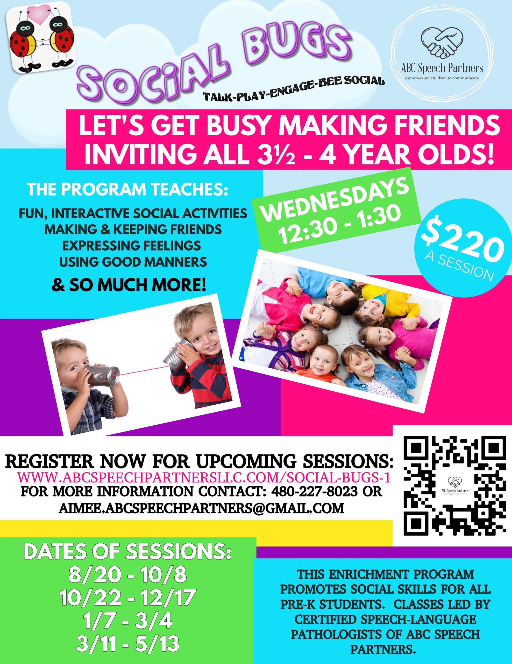 AT SOCIAL BUGS, enrolled preschoolers will participate in exciting activities that foster social and emotional awareness to develop foundational social competencies. With their peers, preschoolers will build social concepts to include whole body listening, making conversation, cooperating in play with peers, making predictions about others intentions, greeting others, making and maintaining friendships, understanding expected social behaviors, turn taking and negotiating, and understand and using nonverbal behaviors. Preschoolers will have the opportunity to describe, demonstrate, practice, and promote their social communication skills through books, songs, games, play, turn taking, role playing, table-top activities, and gross and fine-motor activities.